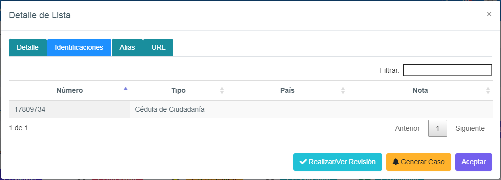 Agrupa todas las identificaciones incluidas en la Lista coincidente asociadas a la Contraparte encontrada (OFAC, ONU, PEPS, Medios, entre otras).