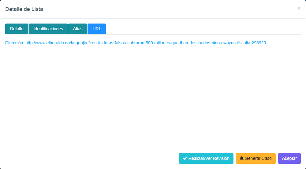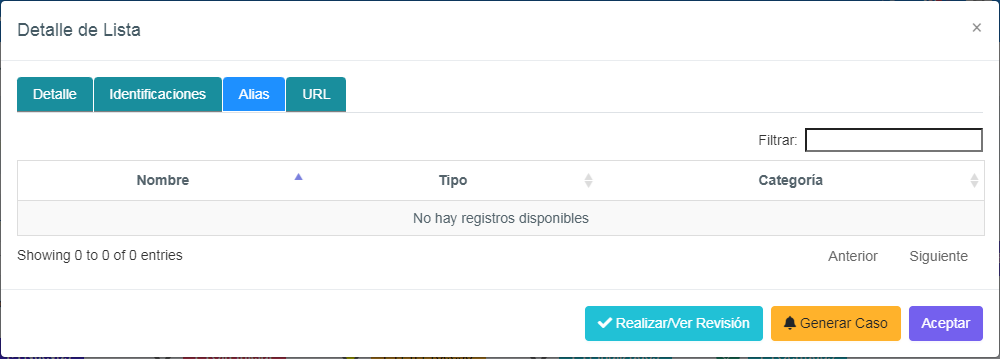 Agrupa todos los alias incluidos en la Lista coincidente asociados a la Contraparte encontrada (OFAC, ONU, PEPS, Medios, entre otras).