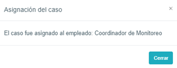 Este botón aparece habilitado únicamente si previamente no se ha generado un caso, Al seleccionarlo se asigna el caso con la coincidencia al usuario configurado en el menú de administración para la atención de coincidencias automáticas y se despliega un mensaje de confirmación como se visualiza a continuación: