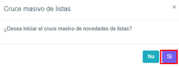 Al oprimir el botón SI inicia el proceso de cruce entre las novedades de listas y las Contrapartes cargadas en la plataforma.