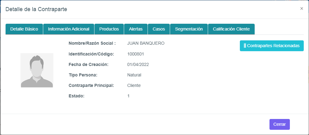Despliega la información básica de la contraparte, como Nombres y Apellidos o Razón Social, Identificación, Estado y Fecha de Creación en la plataforma.