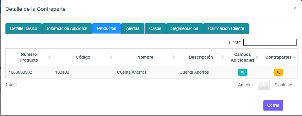 Despliega la información de los productos o servicios que la Contraparte tiene contratados.