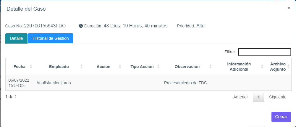 Pestaña que consolida los conceptos entregados en el tiempo por los diferentes responsables que atienden el caso conforme las acciones configuradas para cada perfil. Brinda información de la fecha y hora de la acción, el Empleado que la ejecuta, el tipo de acción, la observación registrada, así como el despliegue de los archivos adjuntados al caso por los diferentes actores.