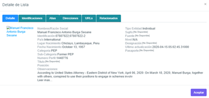 se despliega la información consolidada de lista con la cual se presentó la coincidencia separada por medio de los siguientes tabs: