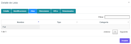 Agrupa los alias asociados a la contraparte encontrada en la lista de referencia (OFAC, ONU, PEPS, Medios, entre otras).