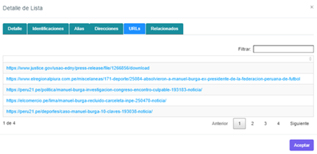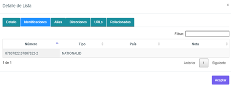 se despliega la información consolidada de lista con la cual se presentó la coincidencia separada por medio de los siguientes tabs: