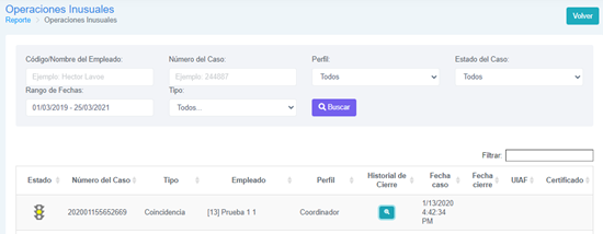 Despliega el nombre del empleado que solicita la coincidencia, así como los parámetros utilizados para realizar la búsqueda. Adicionalmente, despliega el número del caso asignado automáticamente por la plataforma, la fecha de inicio del mismo, así como la duración a través de la cual se realiza el control de vencimiento para notificar a los responsables configurados.