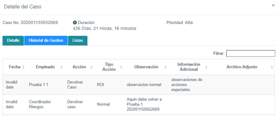 - Historial de Cierre: Permite acceder al historial de gestión del caso, bajo la siguiente estructura: