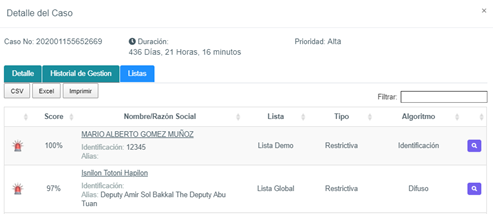 - Lista: Nombre de la lista con la cual se presentó la coincidencia.