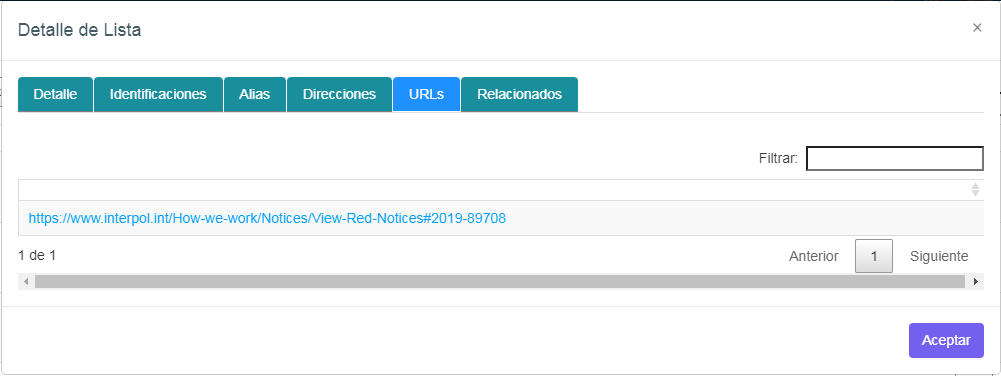 Agrupa todos los alias incluidos en la Lista coincidente asociados a la Contraparte encontrada (OFAC, ONU, PEPS, Medios, entre otras).