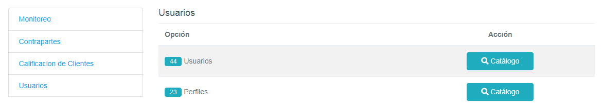 5-10.4. Usuarios Sección de usuarios Aquí podemos encontrar catálogos referentes a los Usuarios Botón Catálogo Mediante este botón podremos acceder a la información del catalogo
